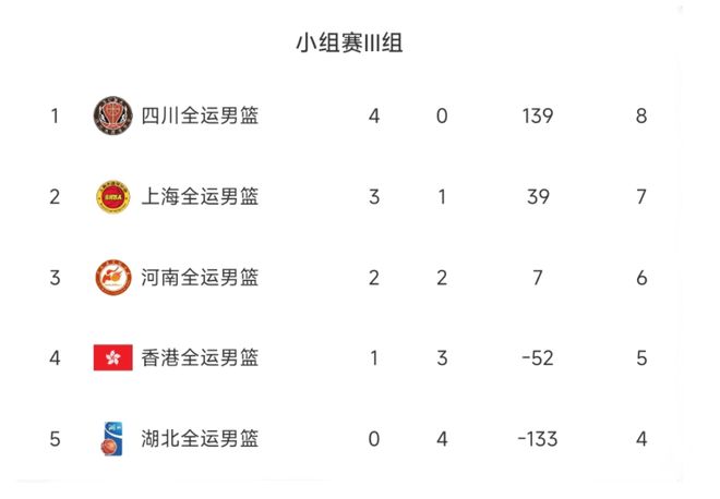 第5名,湖北队,成绩为0胜4负,积4分。