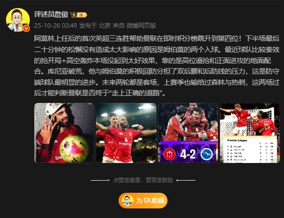 10月26日讯 英超第9轮,曼联主场4-2战胜布莱顿,评述员詹俊先生在社媒做出点评。