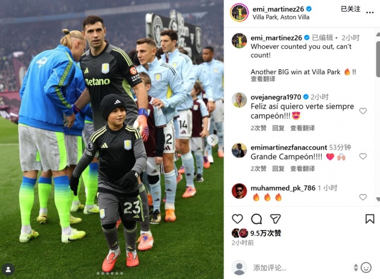 维拉门将马丁内斯也在赛后晒出本场照片,配文写道:“无论谁看低你,都不算数。在维拉公园球场又一场重要胜利!”