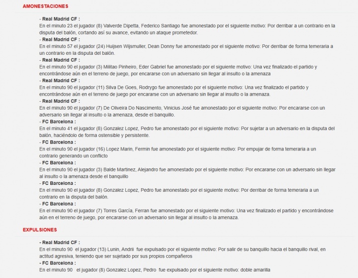 此外,费兰、巴尔德、费尔明、罗德里戈与米利唐因比赛结束仍在场上与对手对峙吃到黄牌。