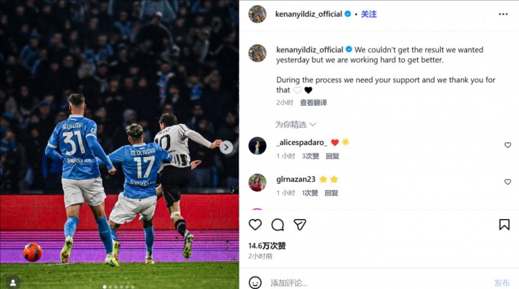 12月9日讯 在尤文1-2输给那不勒斯后,打进尤文唯一进球的伊尔迪兹更新社交媒体,呼吁球迷继续支持尤文。